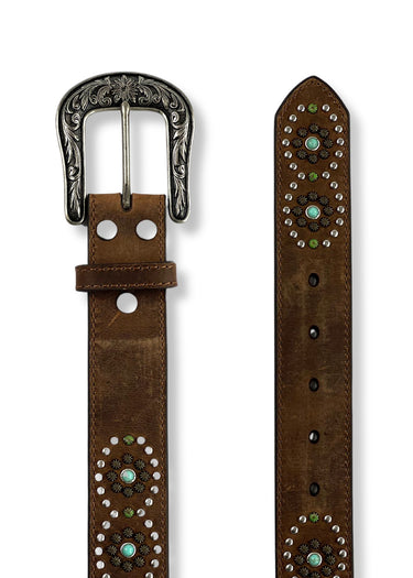 Elegant western style belt for women produced by Nocona. The belt is real leather decorated with steel studs and turquoise colour.