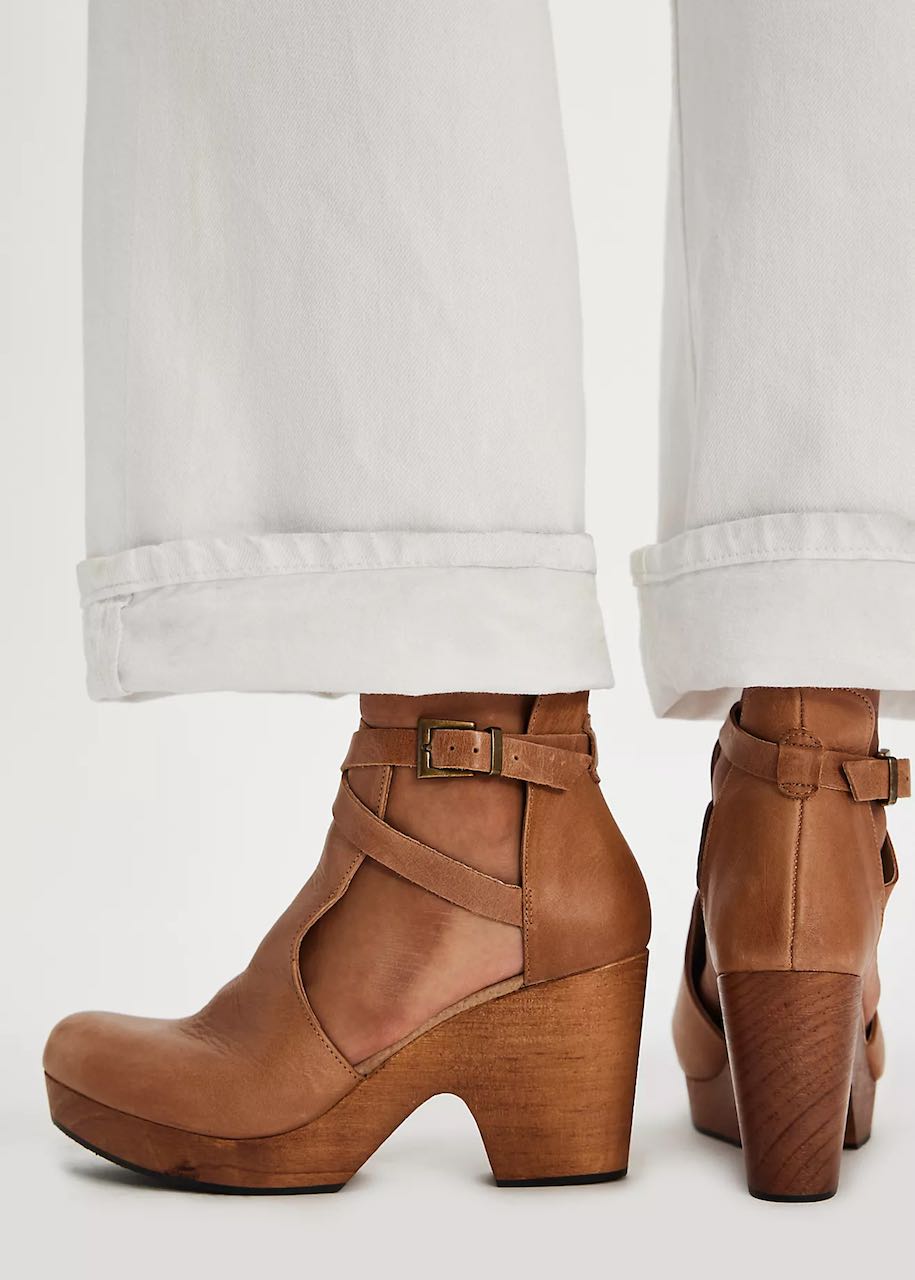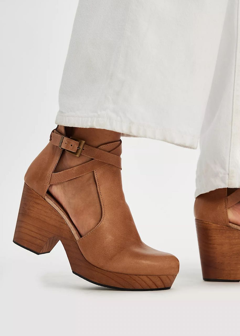 Los zuecos de piel Cedar de Free People combinan estilo boho y materiales de alta calidad en un diseño único. Confeccionados con parte superior de piel y suela de madera de cedro resistente, presentan un detalle recortado hasta el tobillo y tiras cruzadas ajustables con cierre de hebilla. La puntera redonda y el tacón ancho aportan estabilidad y comodidad, mientras que la plataforma de madera realza el look con un toque artesanal y vintage. Perfectas para llevar con vaqueros acampanados o vestidos largos, representan la esencia del estilo bohemio contemporáneo.