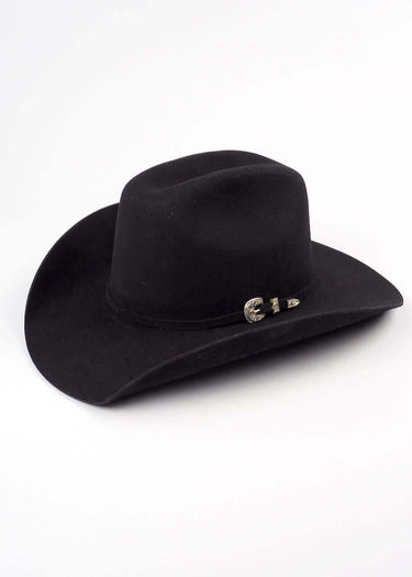 Cappello Western in feltro modello Kingman JR colore nero con un cinturino decorativo di colore nero. Questo cappello per farà sentire il tuo bambino un vero cowboy del Texas.