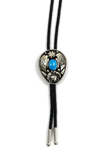La Cravatta da Cowboy Bolo Leaves di Double S è l'accessorio perfetto per arricchire il tuo look western con un tocco elegante e distintivo. Questo bolo tie presenta un cordoncino intrecciato nero con estremità in metallo argentato. Al centro spicca un concho ovale nero impreziosito da un raffinato design a foglie dorate e una pietra turchese in posizione centrale. La lunghezza di 36 pollici (circa 91 cm) rende questa cravatta adatta a qualsiasi occasione formale o casual.