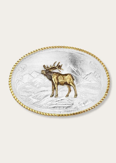 Fibbia Etched Mountain Scene & Bull Elk di Montana Silversmith
