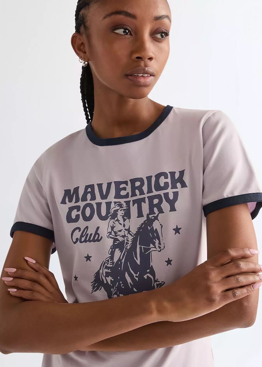 La T-shirt Slim Ringer Tee by Wrangler è un capo iconico che unisce stile retrò e spirito western autentico. Il design con collo e bordi maniche a contrasto richiama le classiche t-shirt vintage, mentre la grafica cowboy con scritta “Maverick Country Club” rende omaggio alla tradizione del brand.